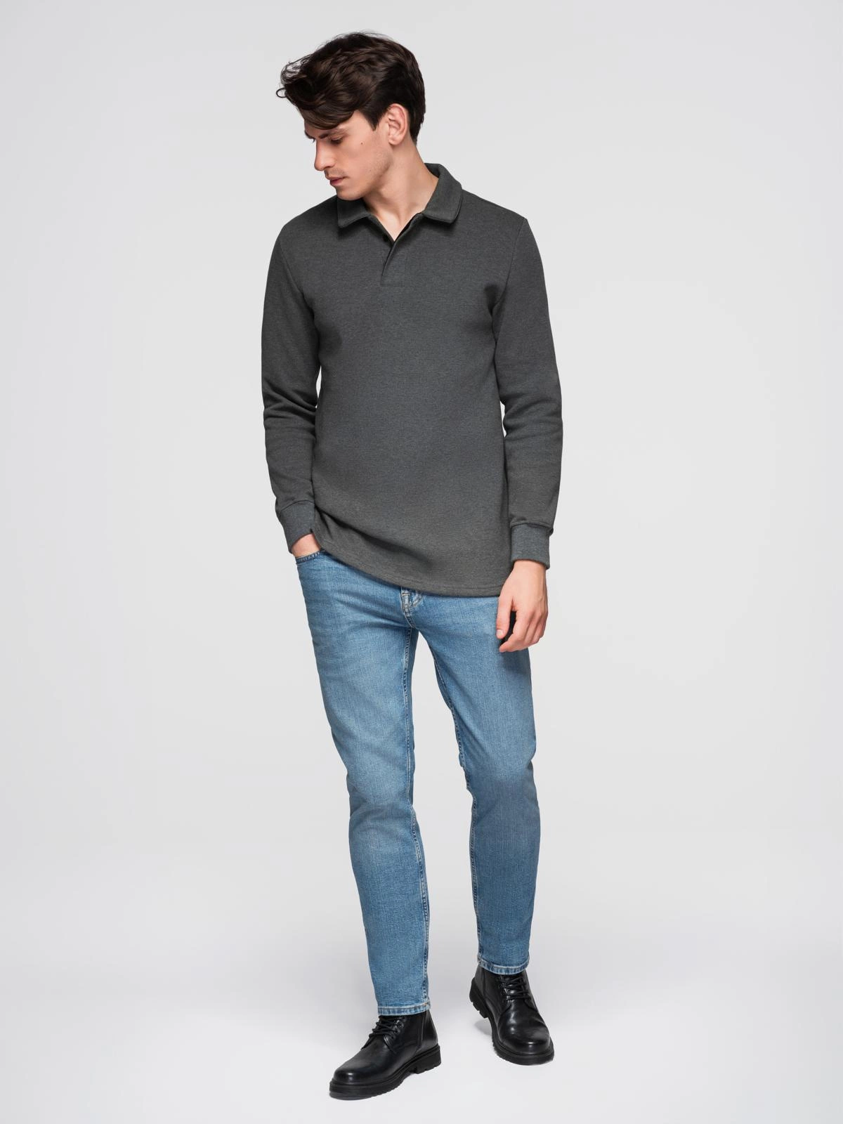 Hanorac cu guler polo cu tricot structurat pentru bărbați - grafit melange V1 OM-SSNZ-0149