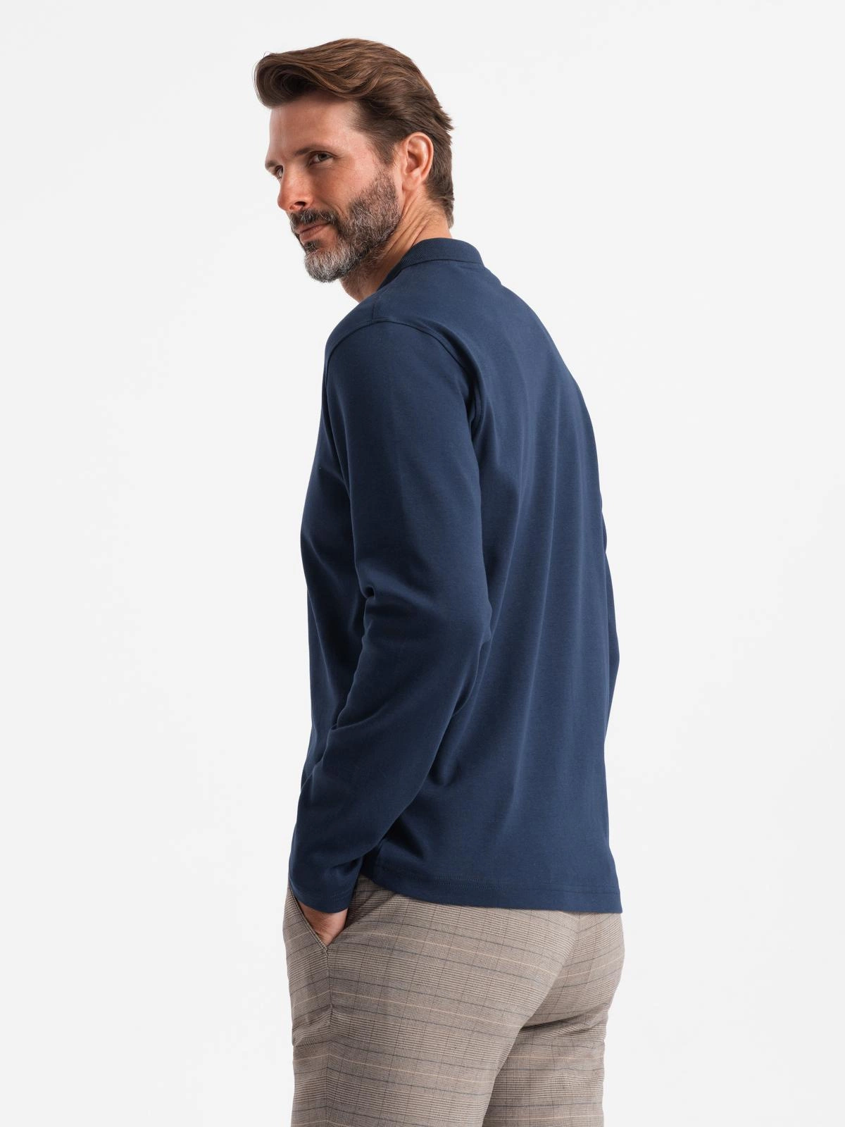 Polo bărbătesc cu mânecă lungă și guler cu fermoar - albastru marin V7 OM-POLS-0130