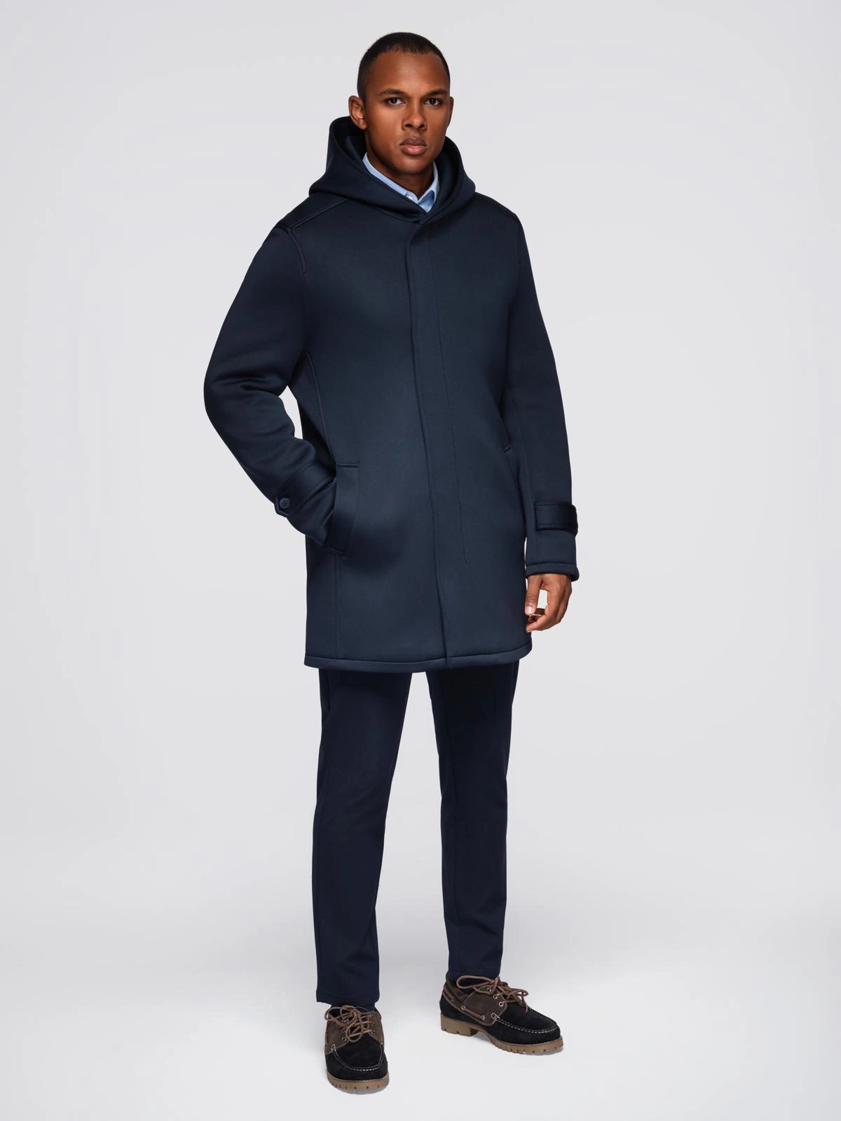 Palton bărbătesc minimalist de lungime medie cu glugă - albastru marin V5 OM-COLC-0144