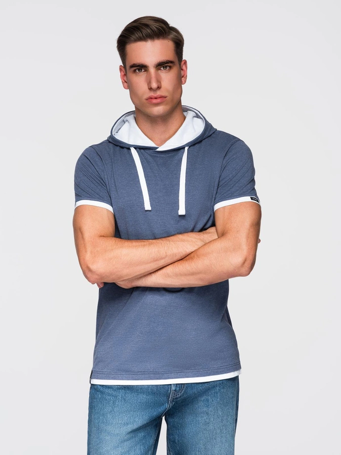 Tricou bărbătesc din bumbac cu glugă - albastru închis melange V12 OM-TSCT-0256
