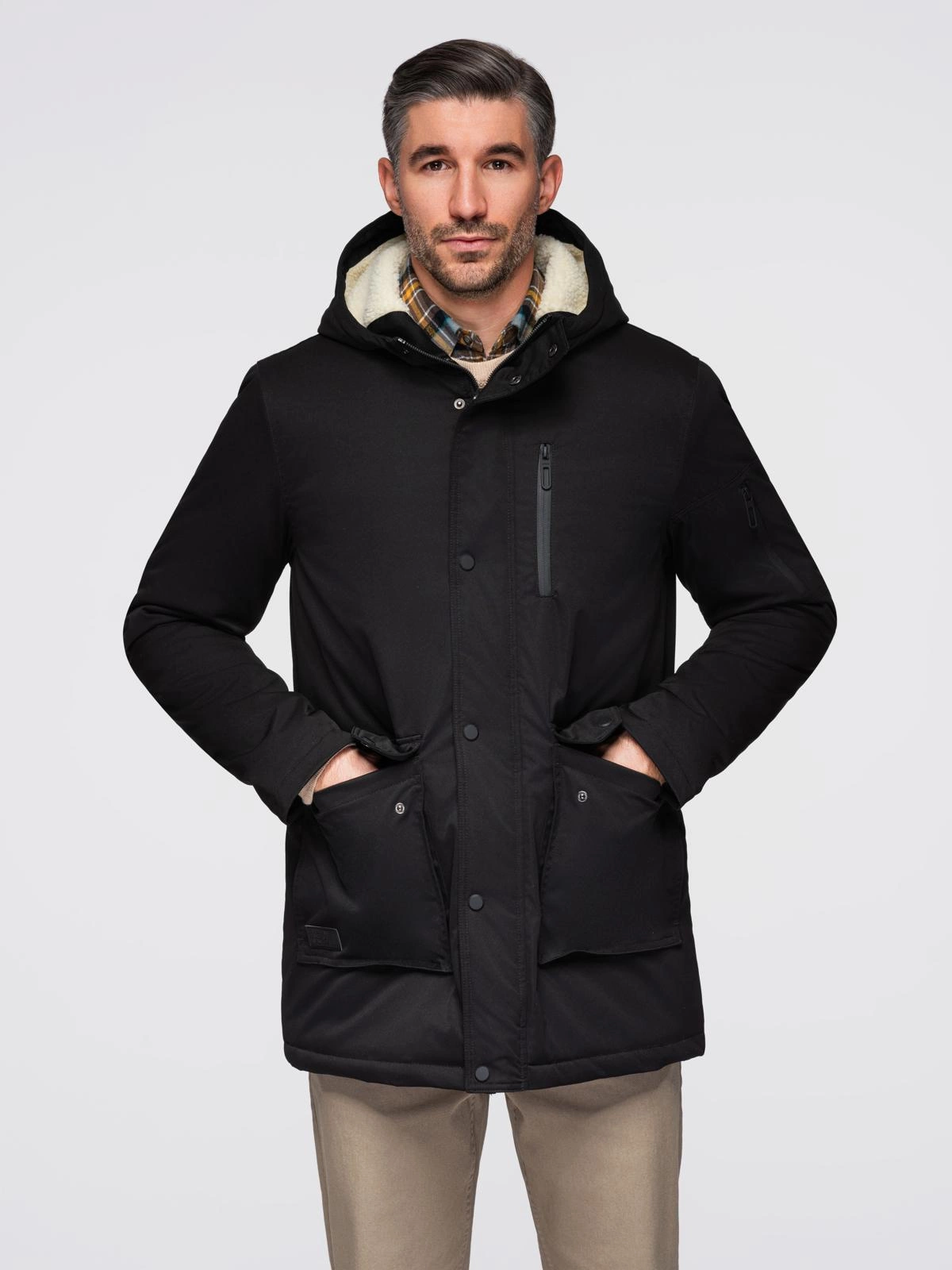 Jachetă parka lungă pentru bărbați cu piele de oaie - negru V4 OM-JAPJ-0316