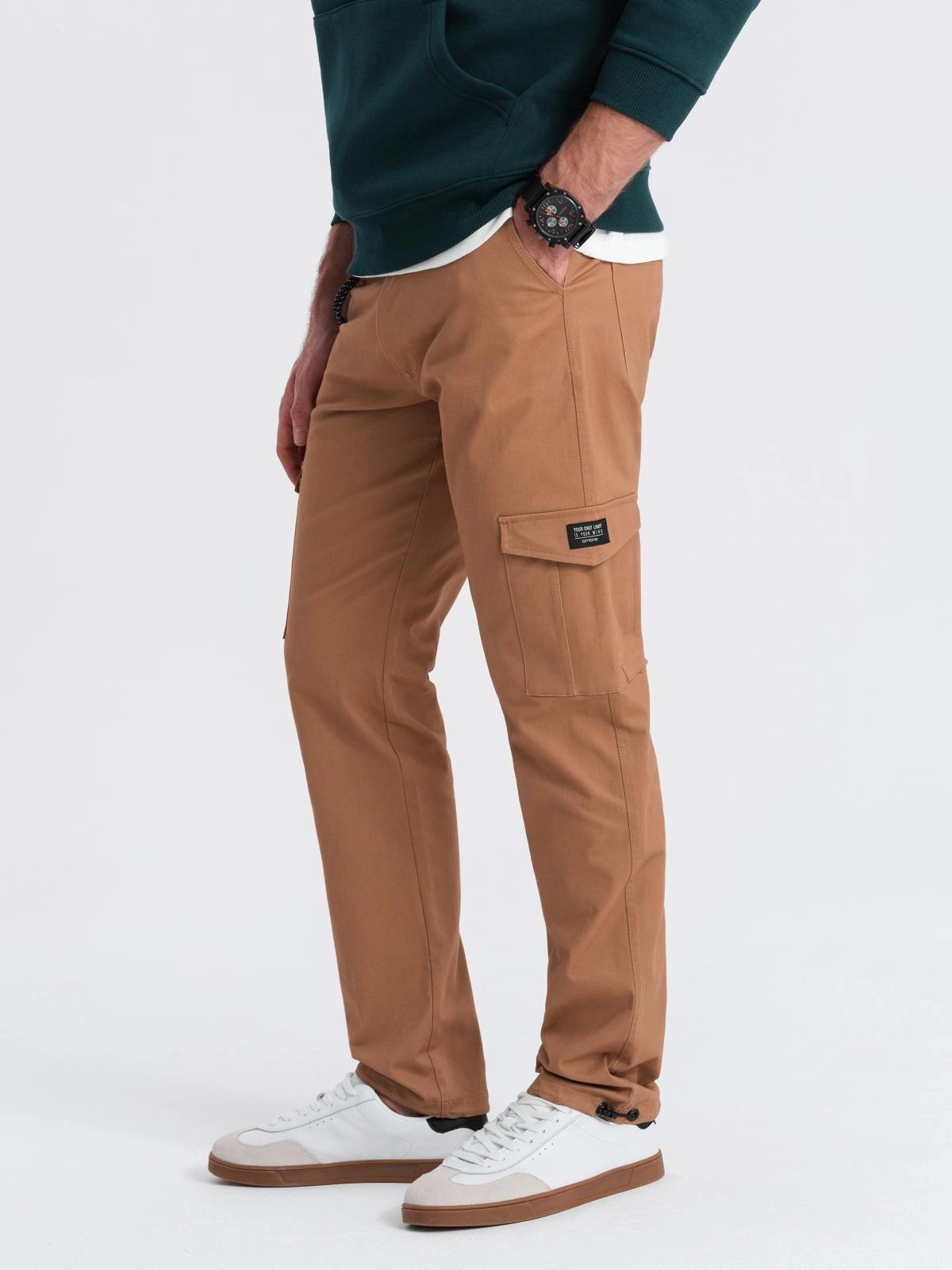 Pánske nohavice s cargo vreckami a lemom nohavíc - svetlohnedé V3 OM-PACG-0189