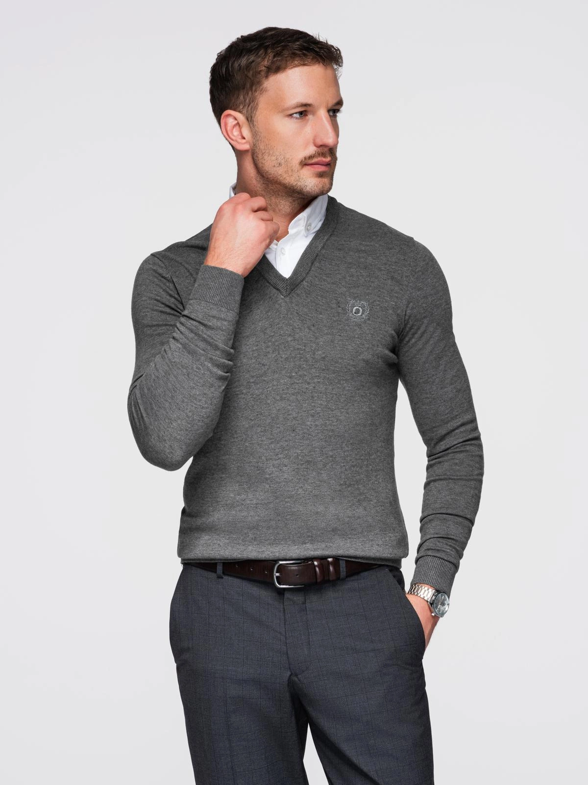 Pánsky sveter s výstrihom do V a košeľovým golierom - grafitový V3 OM-SWSW-0102