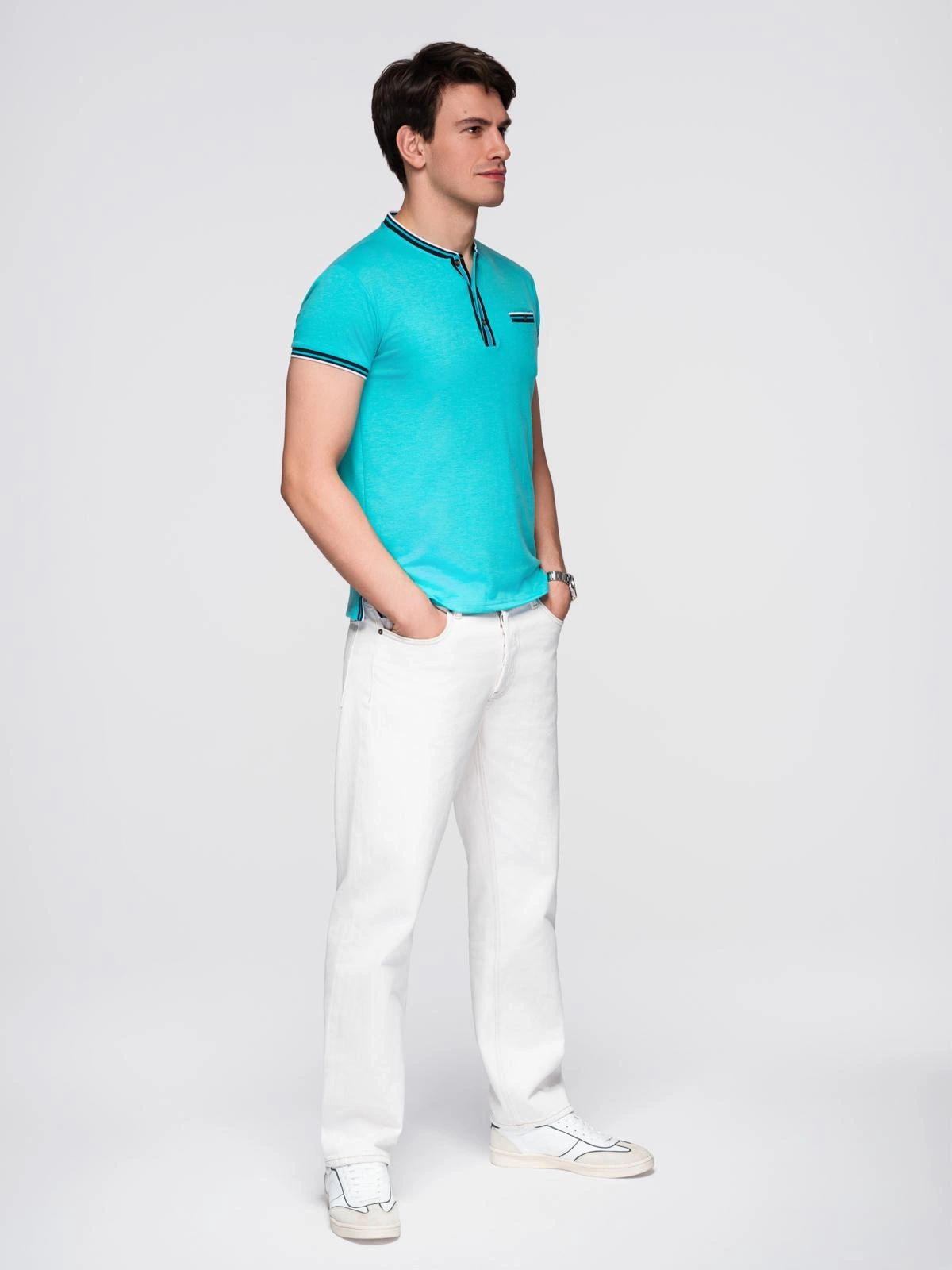 Pánske tričko henley s ozdobným rebrovaním - tyrkysové V7 OM-TSCT-0175
