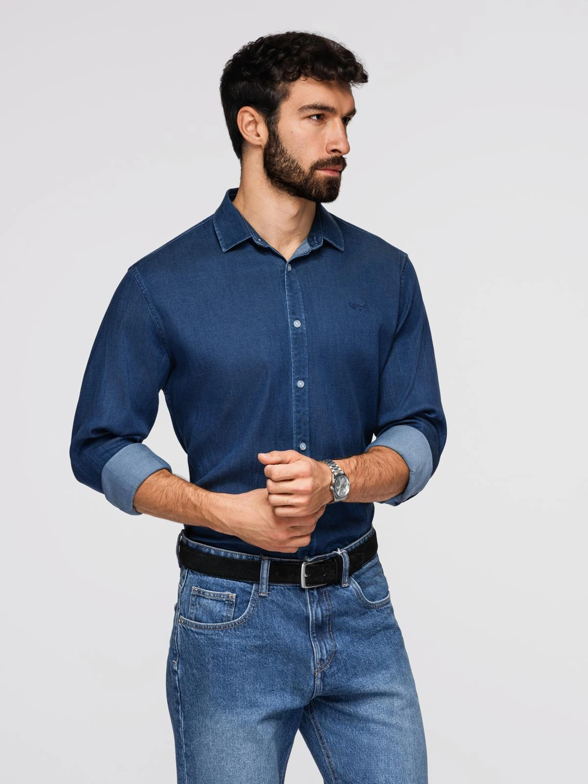 Pánska džínsová košeľa s lyocellom a výšivkou na hrudi - tmavomodrá V1 OM-SHDS-0180