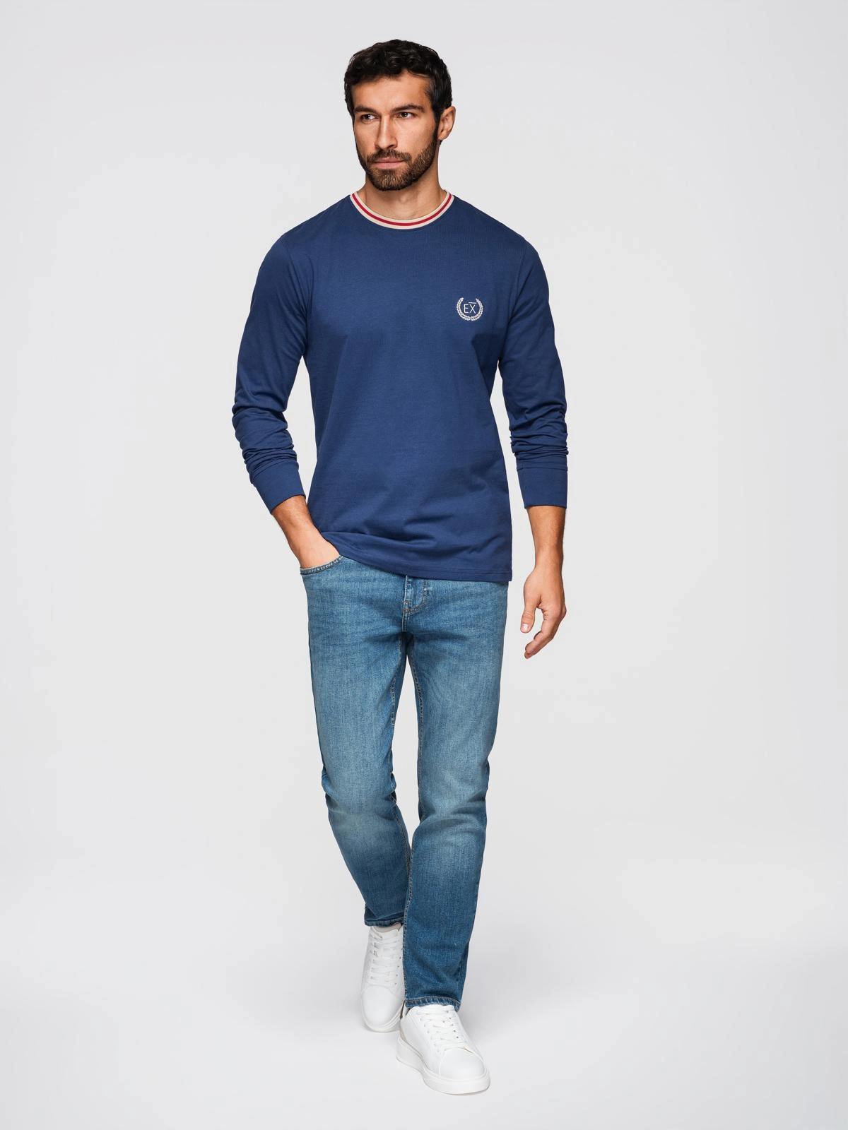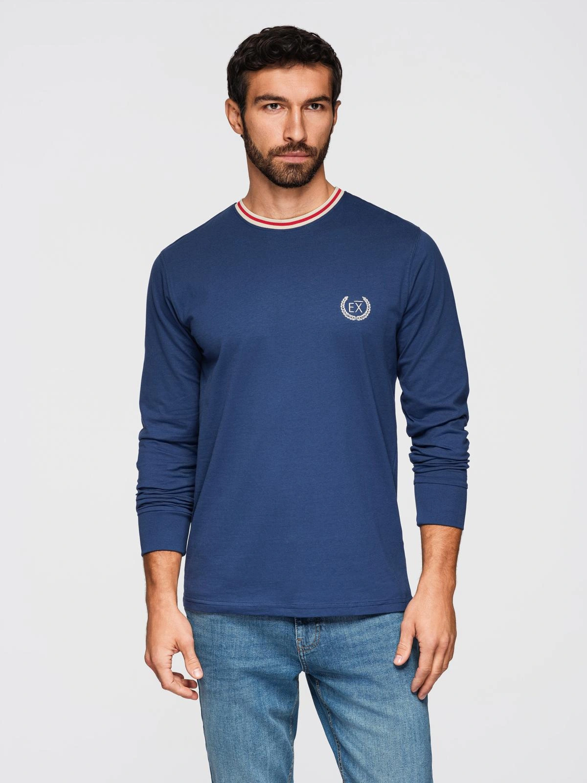 Pánske bavlnené tričko s dlhým rukávom, pruhovaným výstrihom do U a výšivkou - tmavomodré V3 OM-LSCL-0128