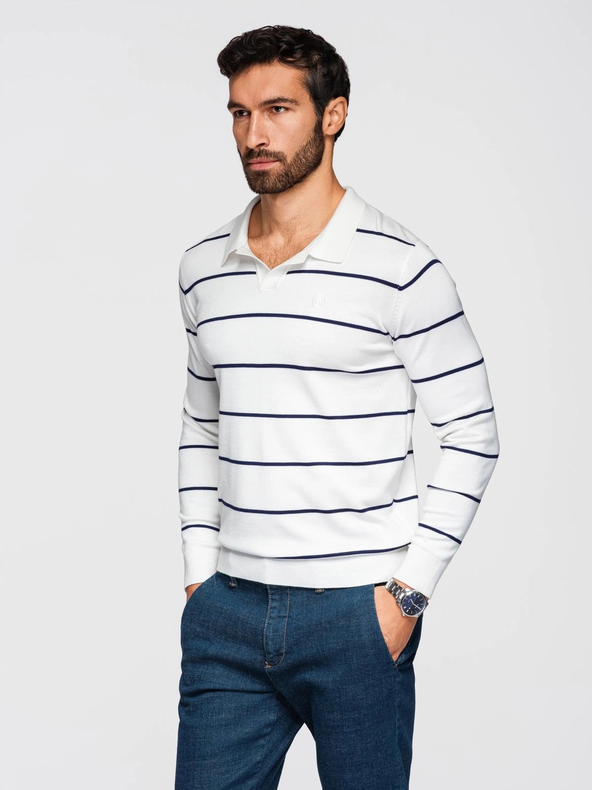 Pruhované oblečenie s dlhým rukávom a golierom polo je dobrým spôsobom, ako rozbiť módnu rutinu v elegantnom ležérnom štýle. Kontrastné pruhy sa budú dobre hodiť k chinos nohaviciam alebo saku pre ležérny elegantný vzhľad. Jemný viskózový úplet dodáva košeli eleganciu a rafinovanosť, zatiaľ čo výšivka na hrudi zdôrazňuje štýlový charakter dlhého rukáva. Vďaka tomu je ideálnou voľbou do práce alebo na rodinné stretnutia.