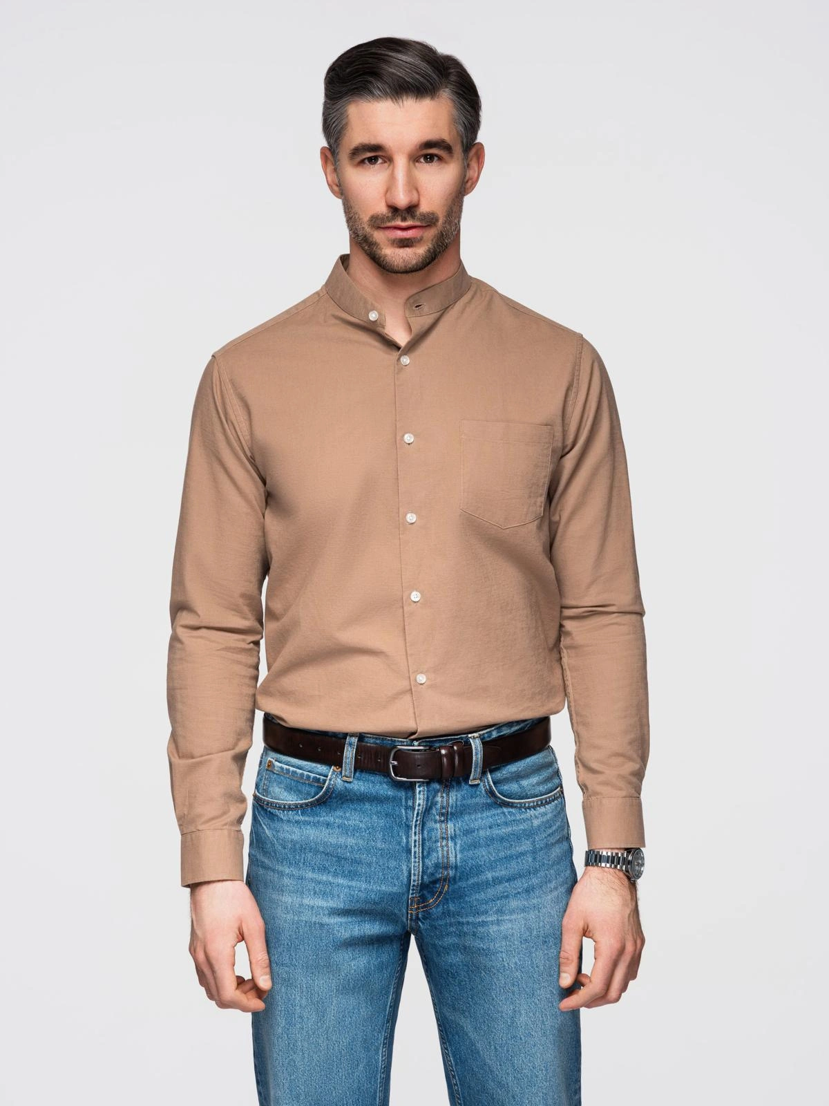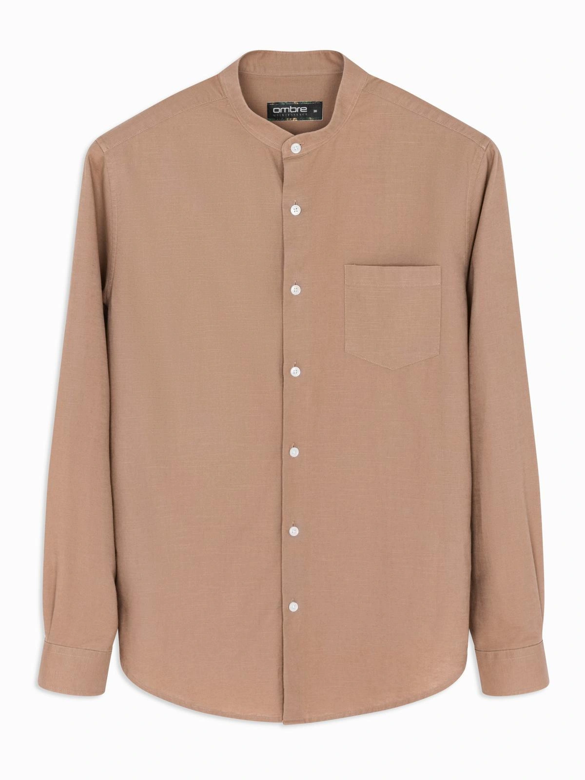 Pánska ľanová košeľa so stojačikom a vreckom REGULAR FIT - svetlohnedá V7 OM-SHCS-0161
