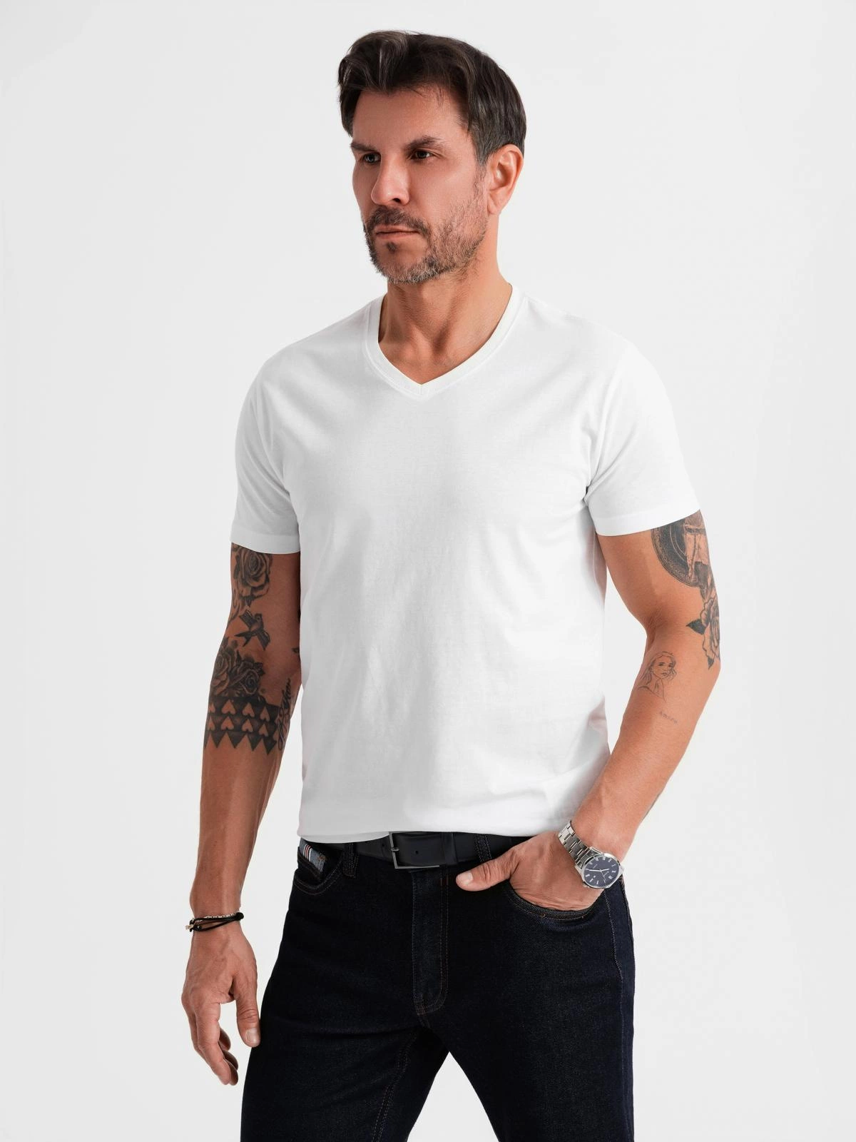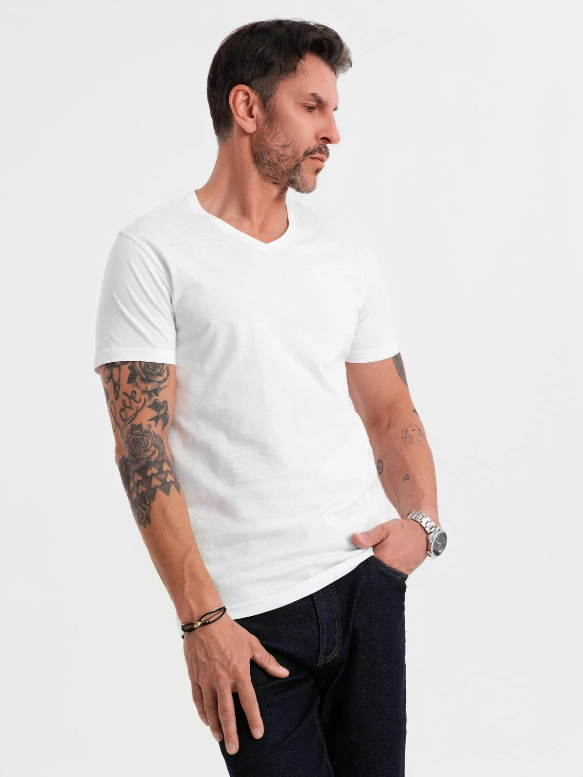Pánske klasické bavlnené tričko BASIC s výstrihom - biele V4 OM-TSBS-0237