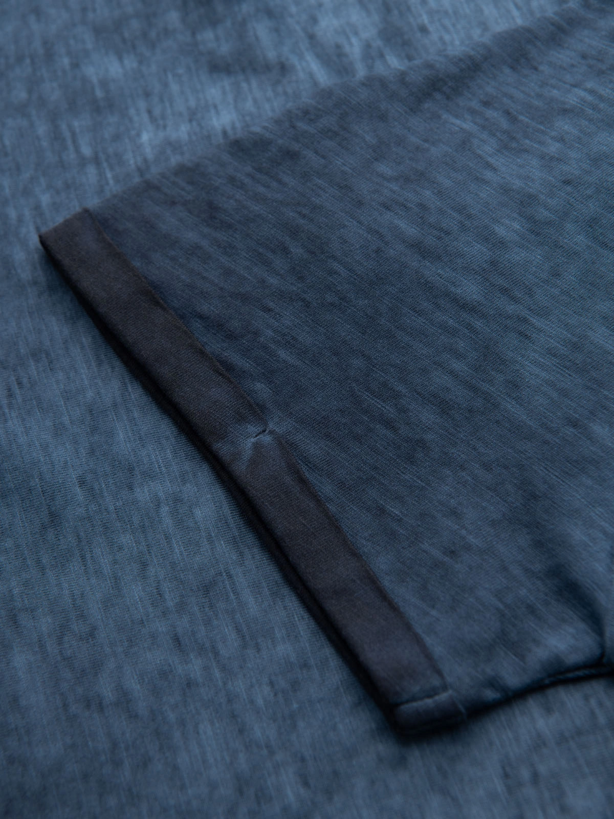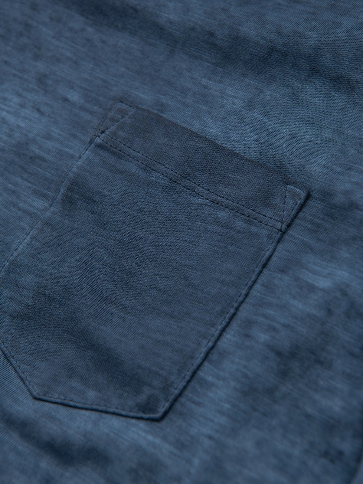 Pánske tričko klasického strihu s výstrihom, vyrobené z bavlneného úpletu slub jersey príjemného na dotyk. Mierne melanžová štruktúra s vypraným efektom dodáva uvoľnený, neformálny pocit. Model má náprsné vrecko a jemne vyhrnuté rukávy pre ležérny každodenný vzhľad. Svetlé pranie pripomínajúce vintage estetiku dodá šmrnc a individualitu tlmeným ležérnym súpravám.