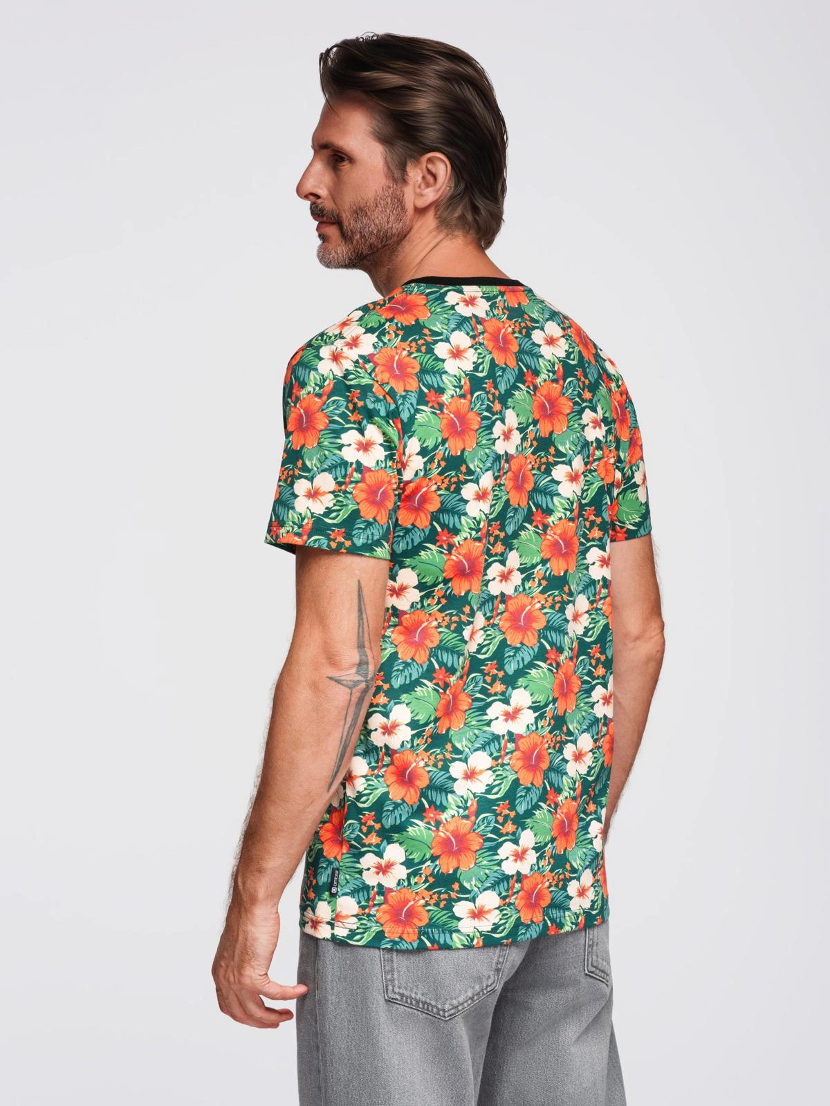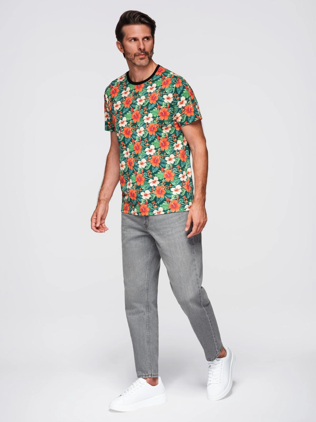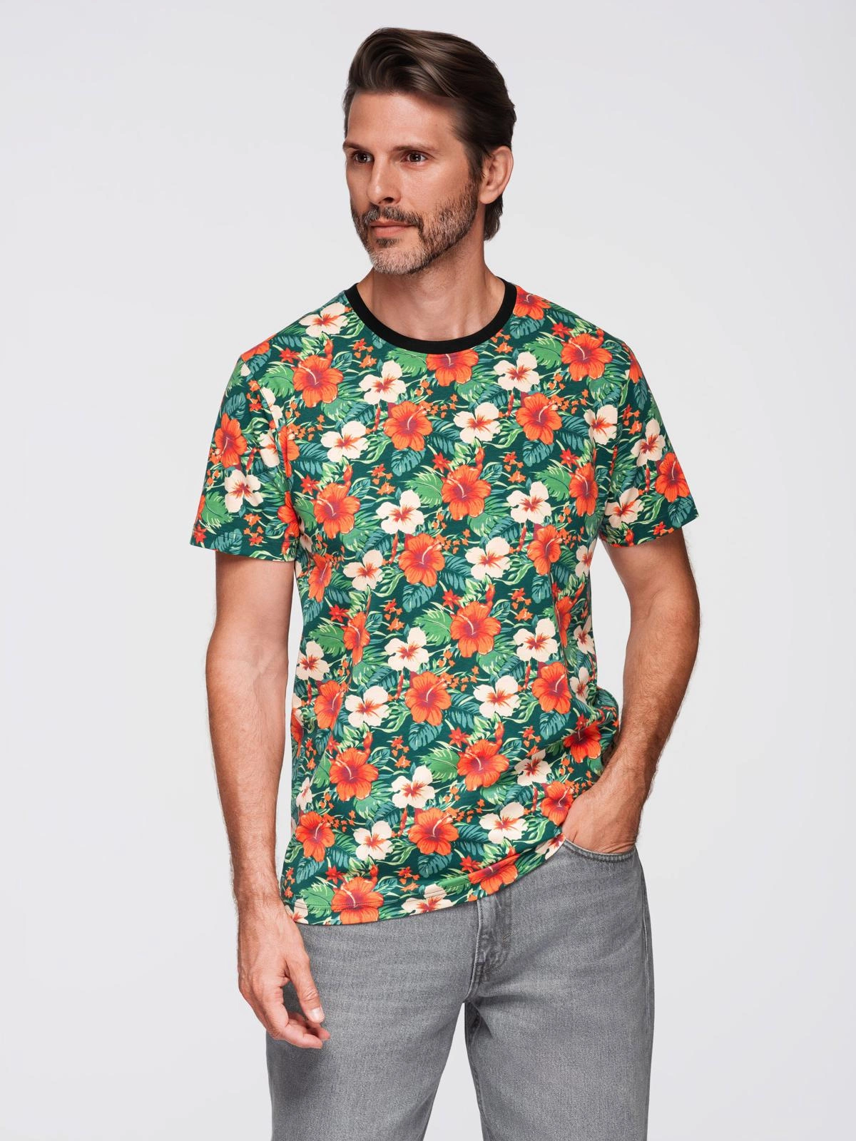 Pánske bavlnené tričko s kvetinovou potlačou - čierne V2 OM-TSFP-0249