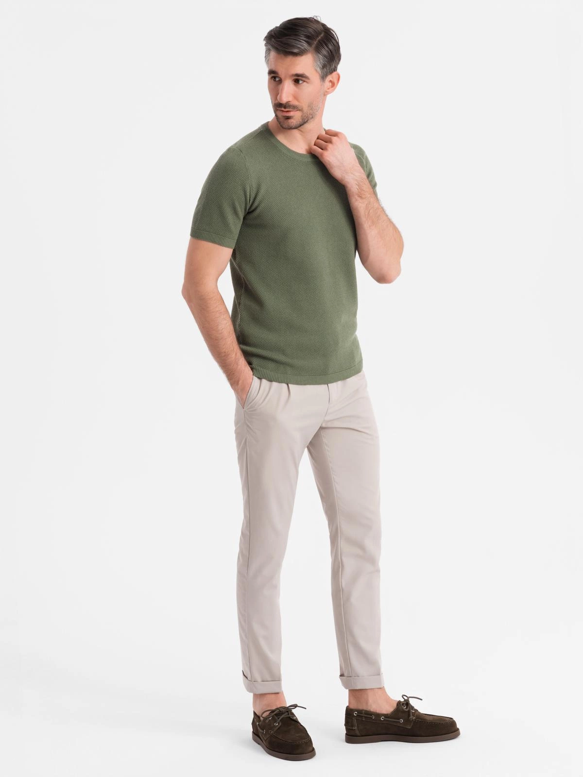 Pánska pletená košeľa s jemnou textúrou - olivová V5 OM-TSCT-0244