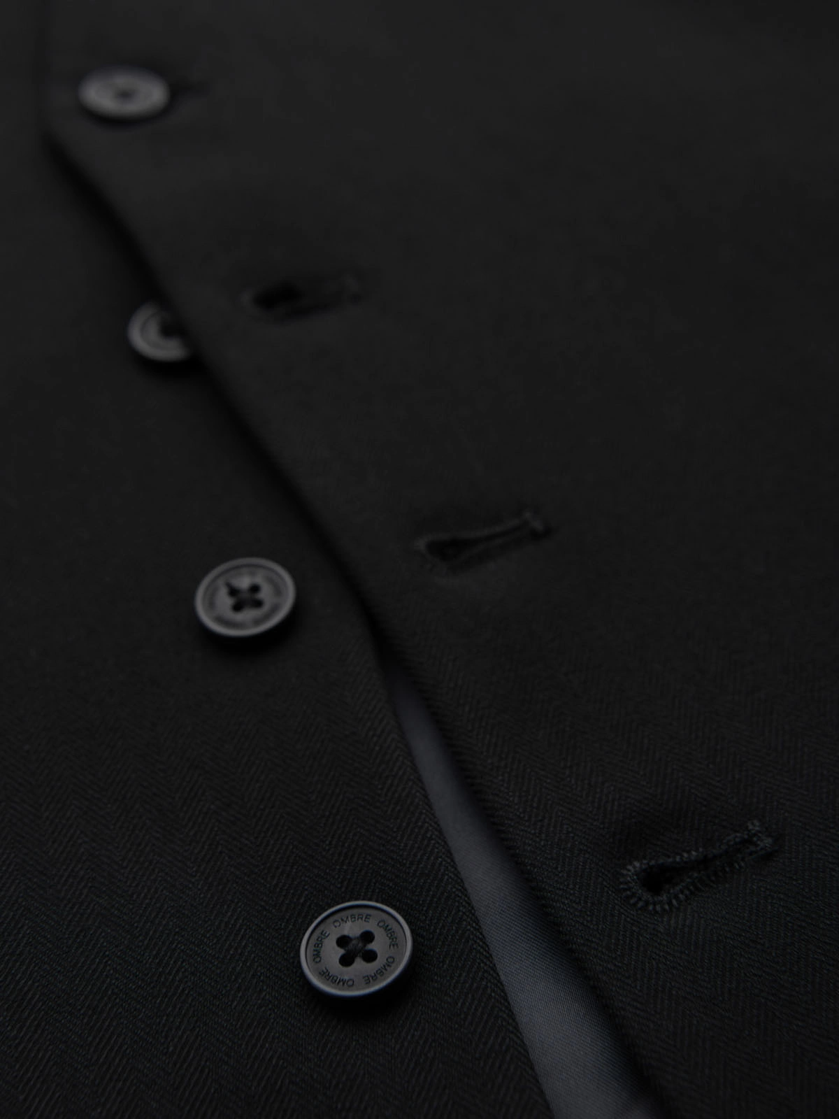 Táto štýlová pánska vesta na mieru, vyrobená z látky s klasickým vzorom rybej kosti, je dokonalým doplnkom elegantného ležérneho štýlu. Vďaka svojmu modernému slim fit strihu zvýrazňuje siluetu a poskytuje elegantný a zároveň ležérny vzhľad. Jemné označenie a premyslené detaily z neho robia univerzálnu voľbu do kancelárie aj na spoločenské stretnutia. Dobre sa kombinuje s košeľou aj rolákom. Univerzálny základ pre elegantné ležérne aj formálnejšie outfity. - Vytvorte si s ňou kompletný vzhľad!