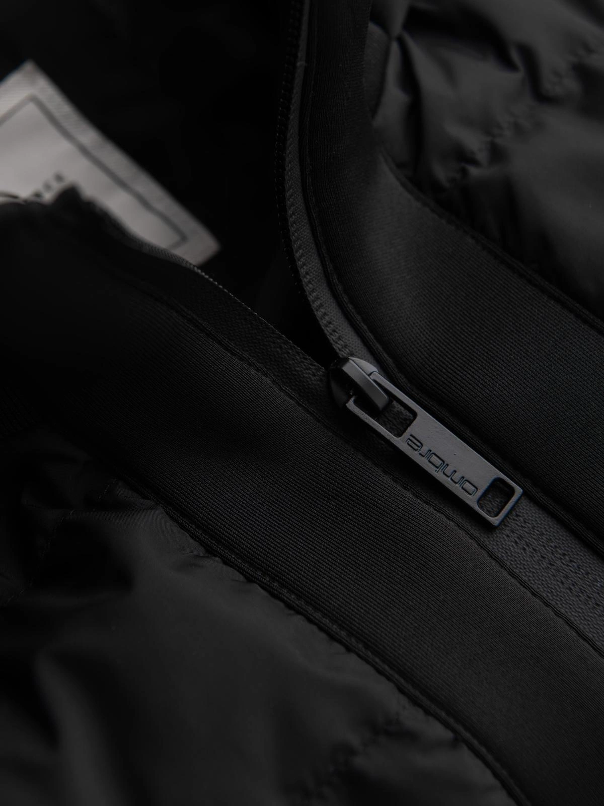 Táto bunda z kolekcie Quintessence je moderným poňatím klasickej bomber bundy a predstavuje esenciu mestského štýlu s nádychom elegancie. Prešívaná predná a zadná časť kontrastuje s pletenými rukávmi a vytvára zaujímavý celok s osobitým charakterom. Vďaka ľahkému zatepleniu, vysokému golieru a nastaviteľnej kapucni je ideálna na chladnejšie dni bez toho, aby stratila svoj módny výraz. Je ideálnou voľbou pre muža, ktorý si cení dizajn, pohodlie a funkčnosť.