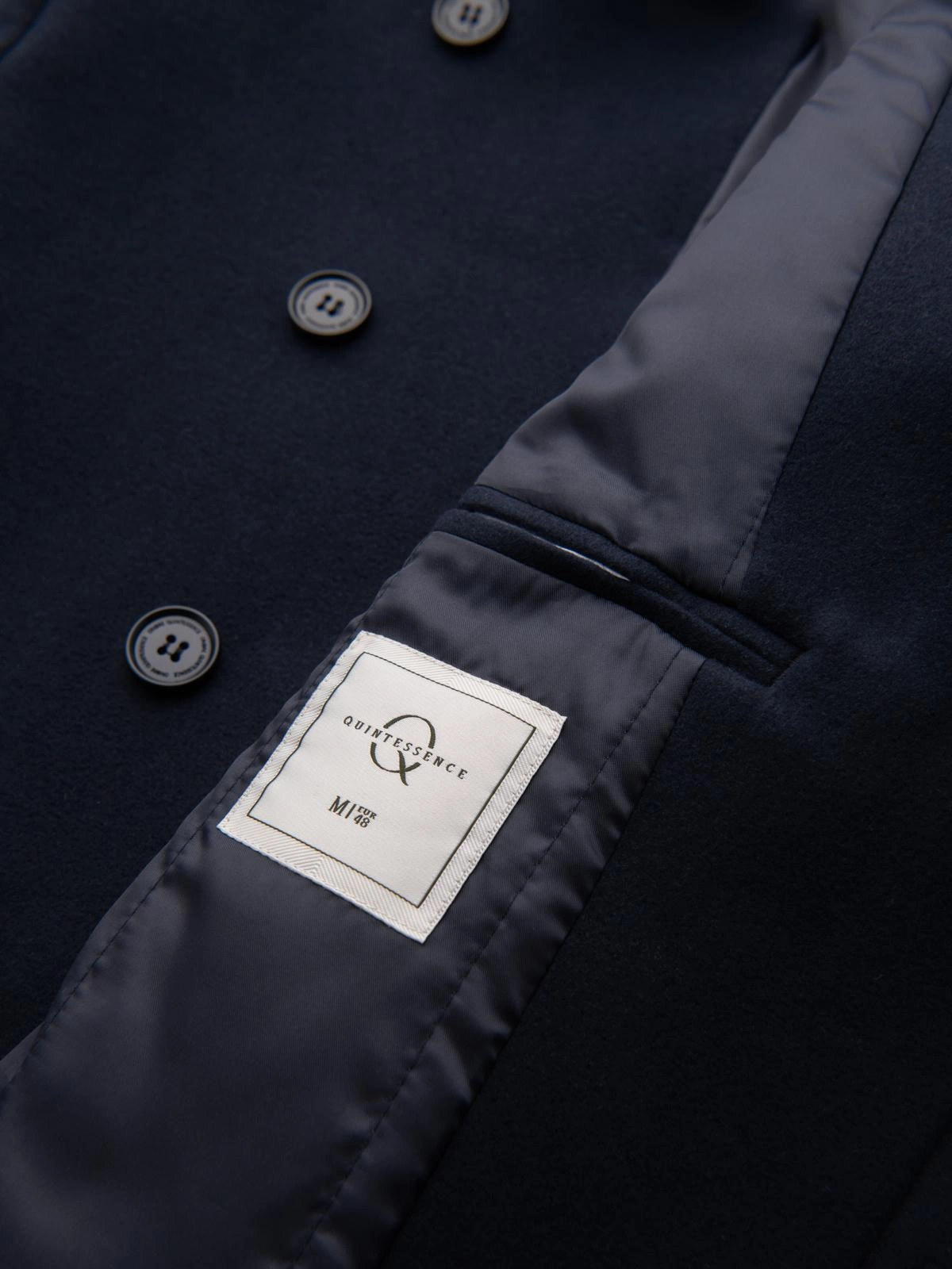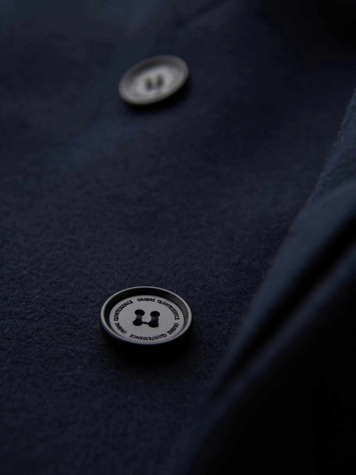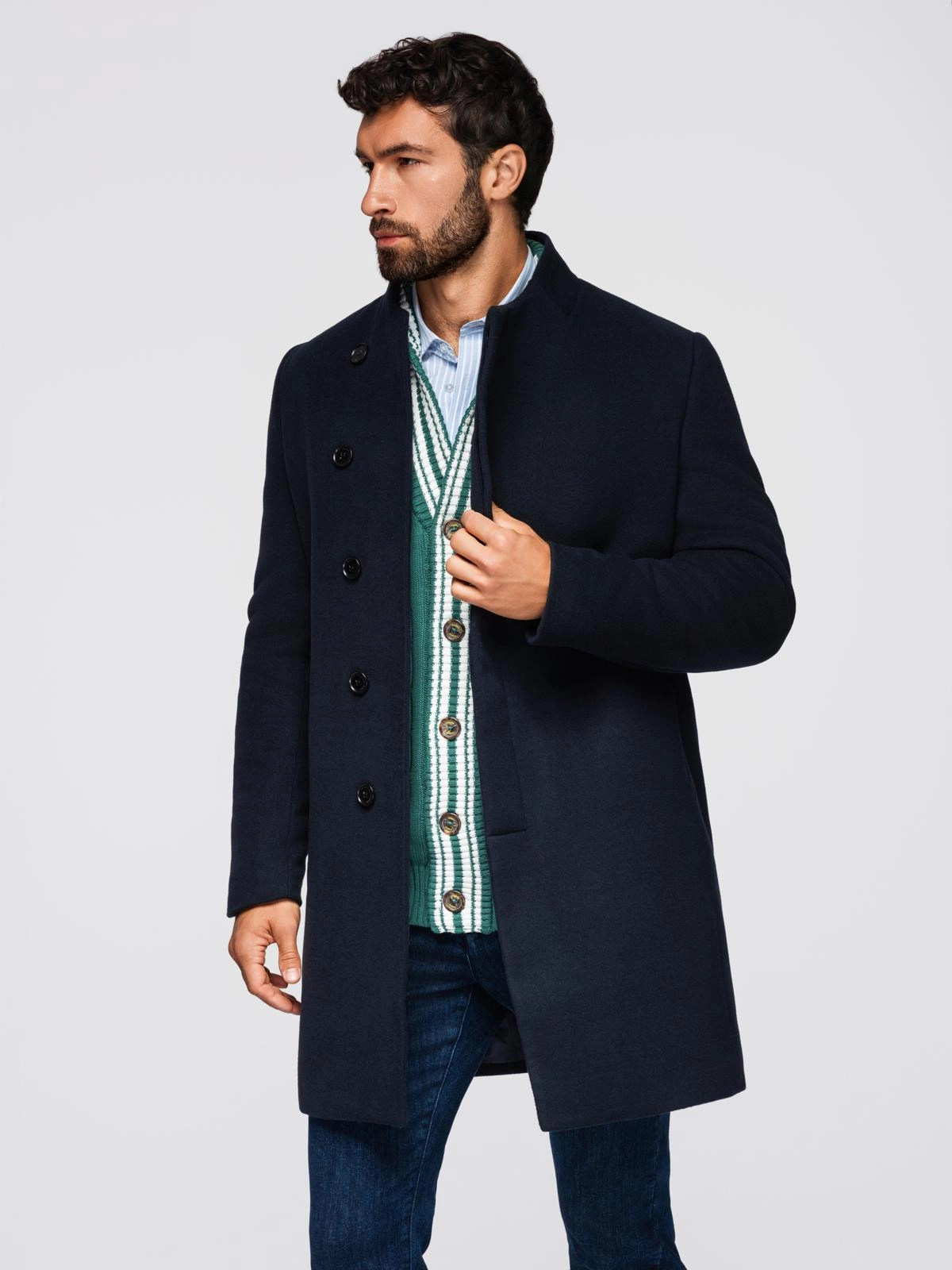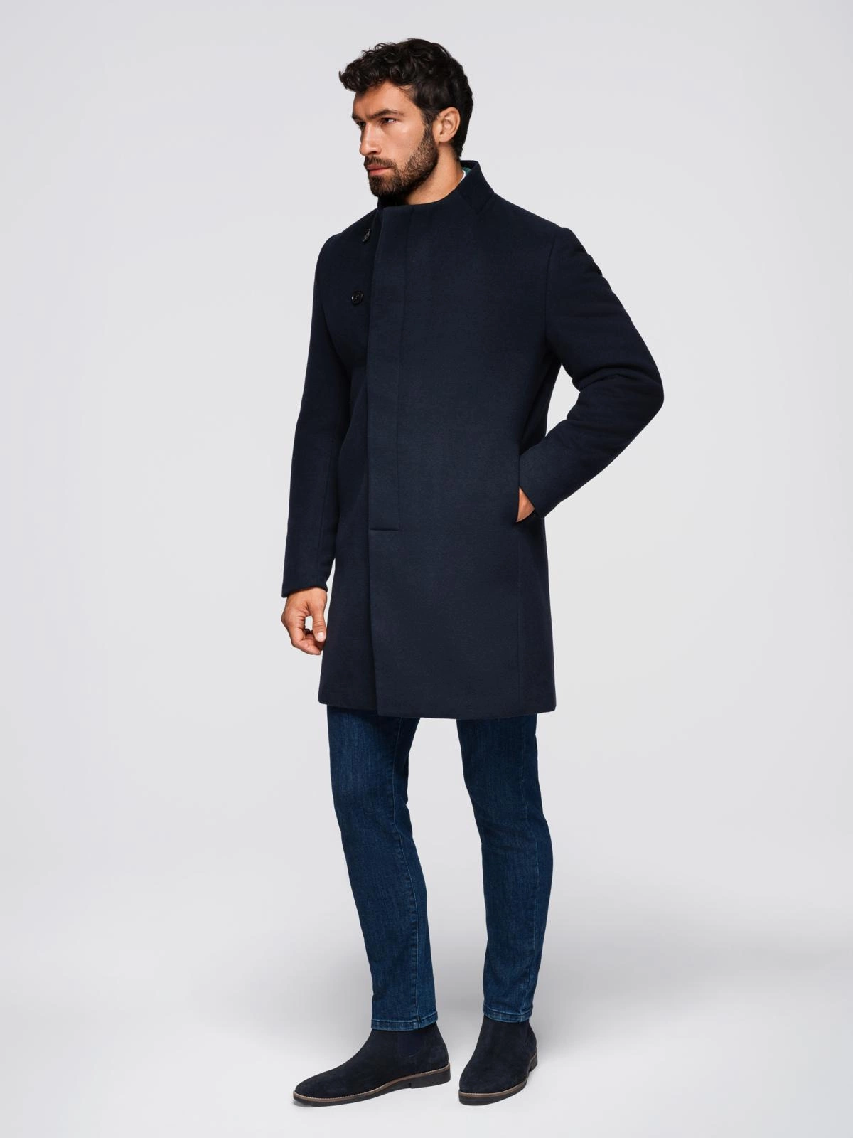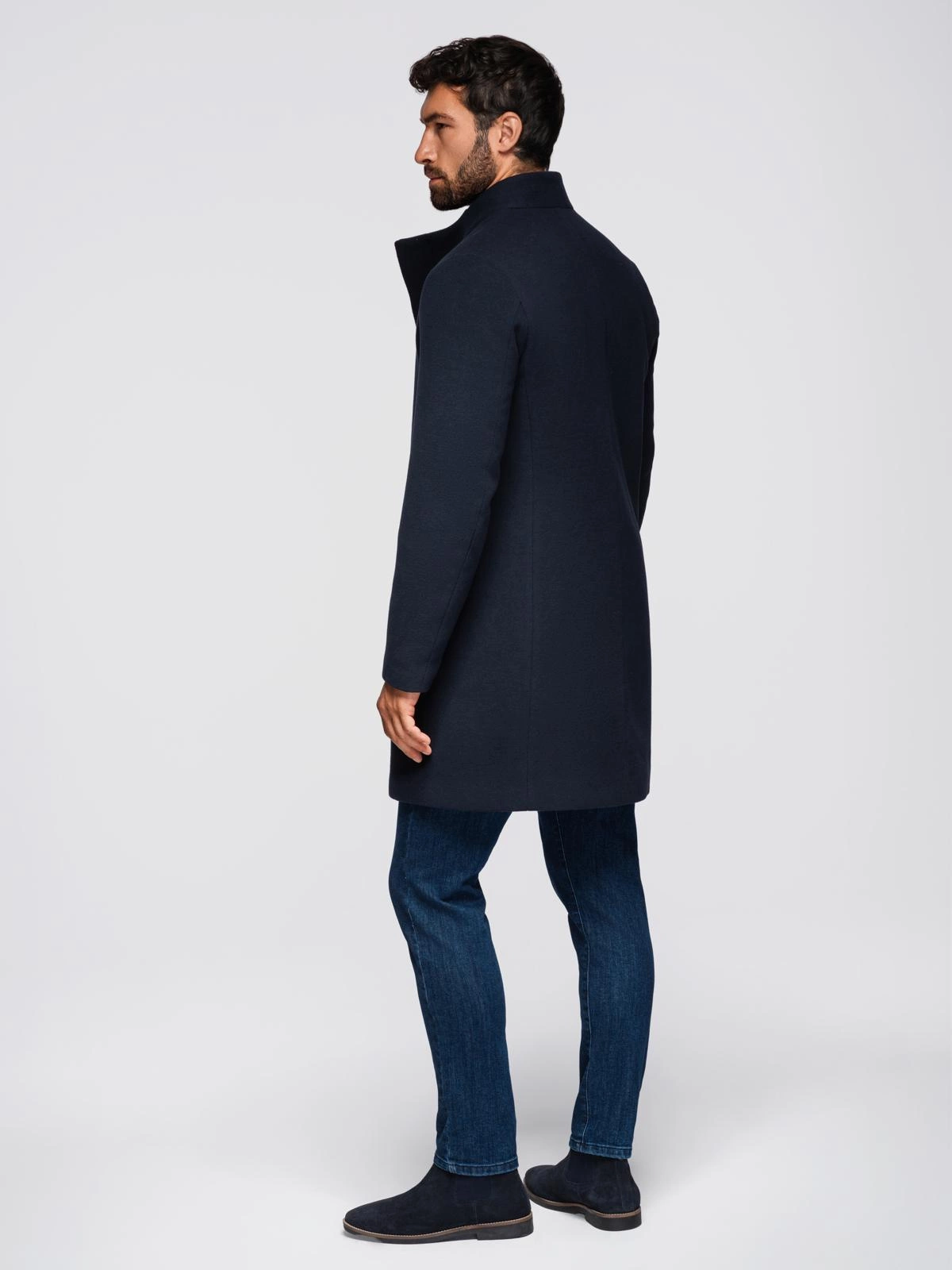 Pánsky kabát s asymetrickým zapínaním a vysokým golierom - tmavomodrý V3 OM-COWC-0141
