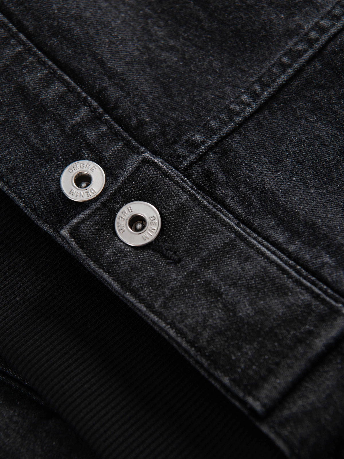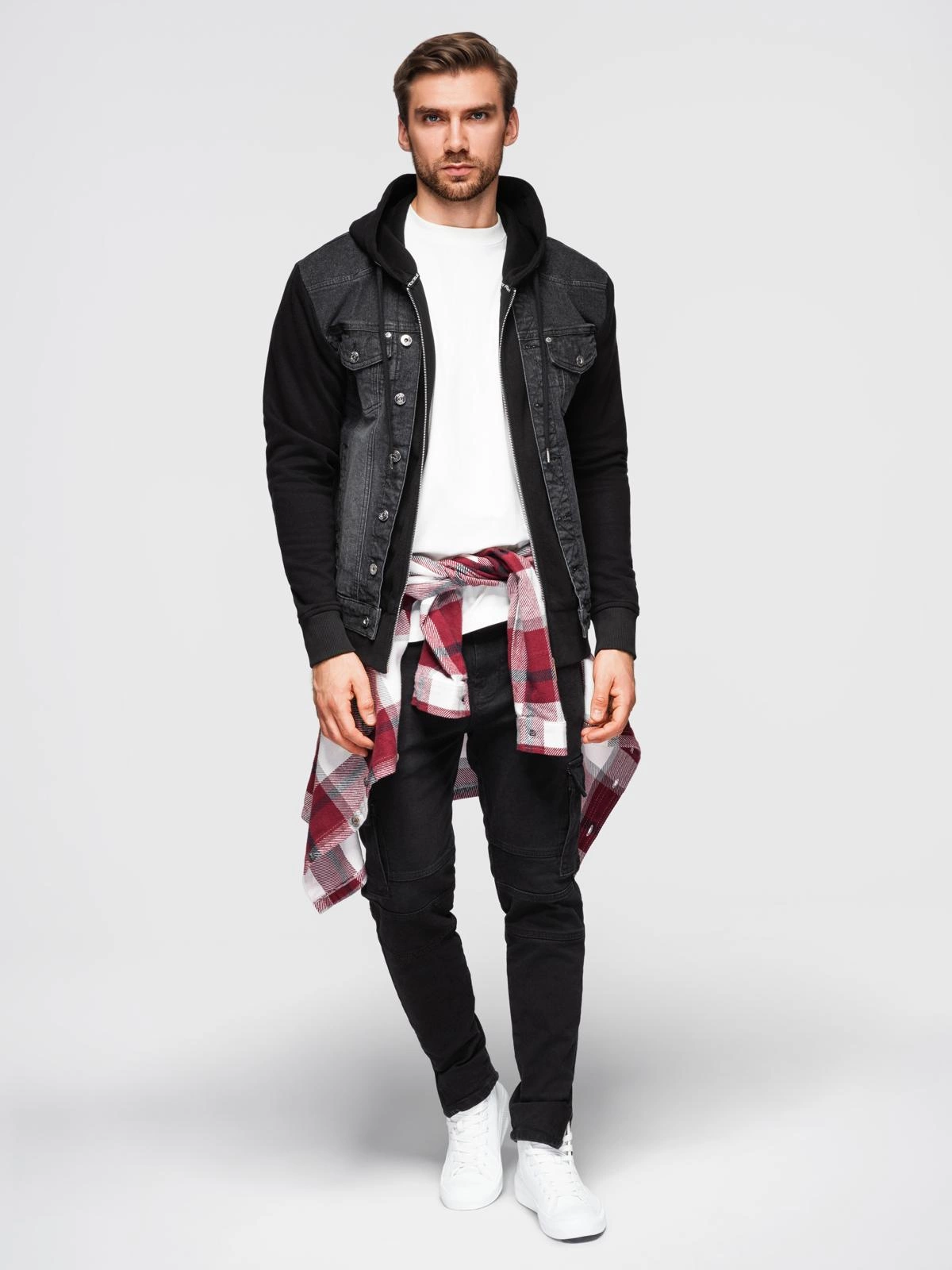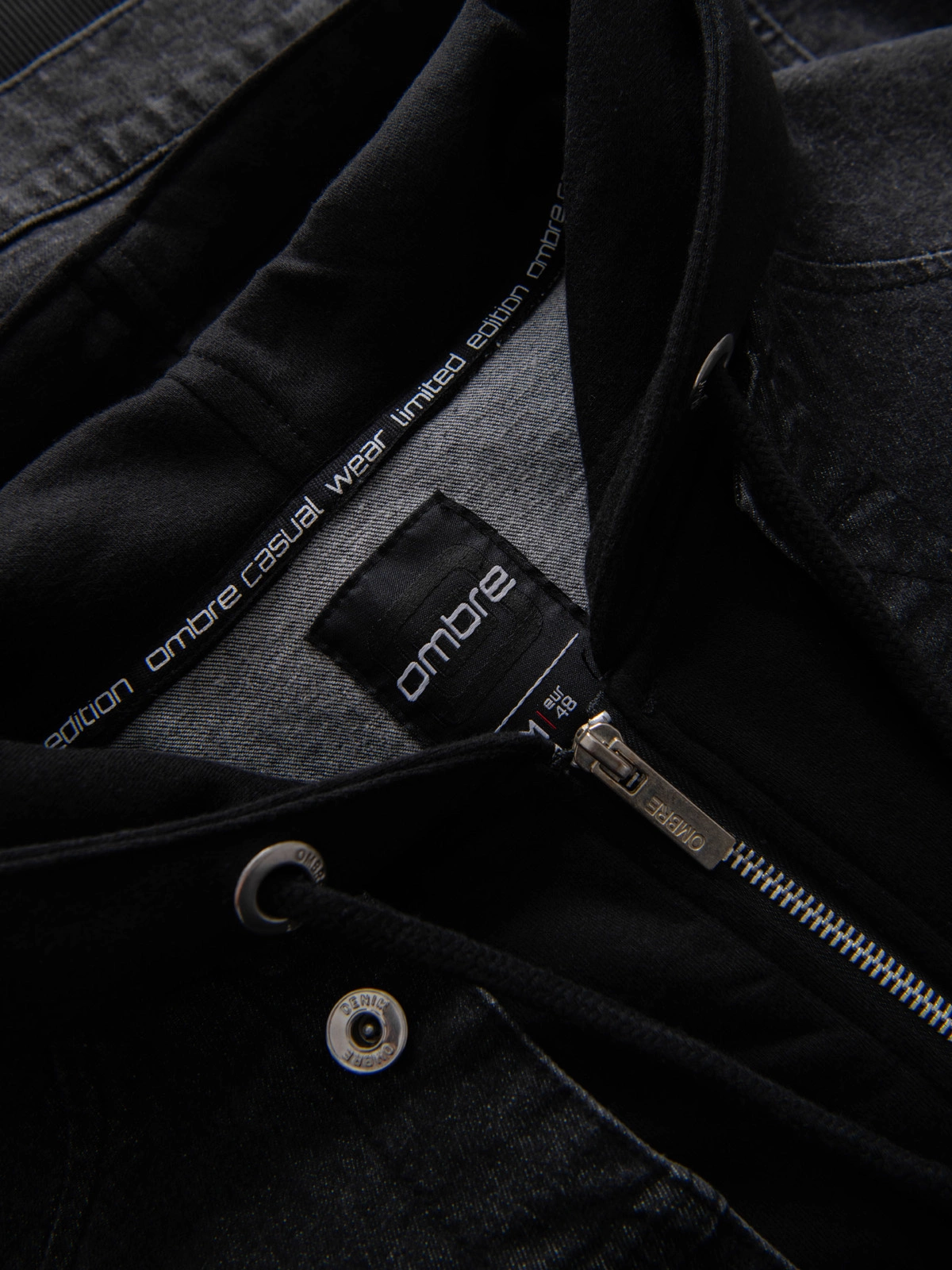 Pánska džínsová bunda s pletenými rukávmi a kapucňou - čierna V3 OM-JADJ-0220