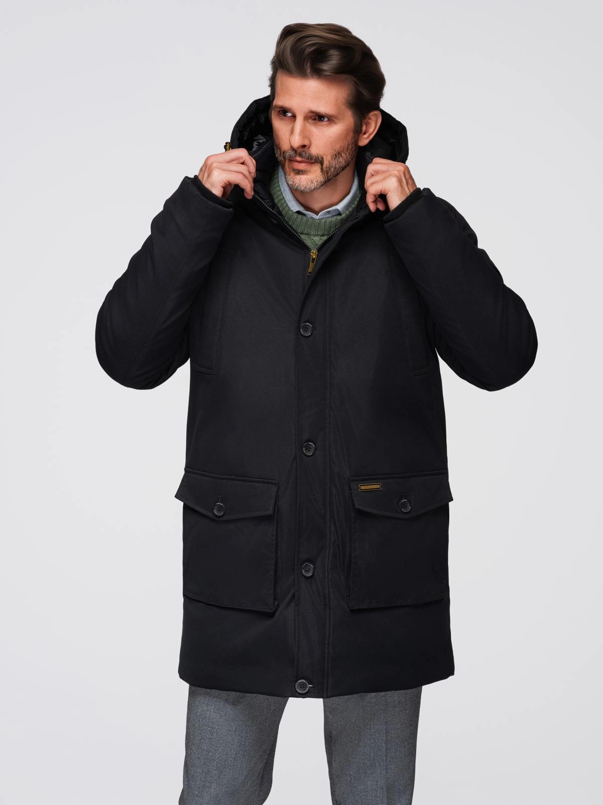 Elegantná pánska parka s vreckami a kapucňou - čierna V1 OM-JAPJ-0287