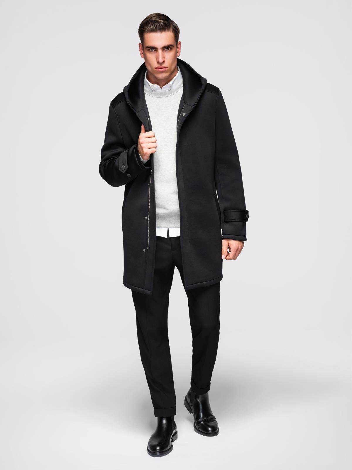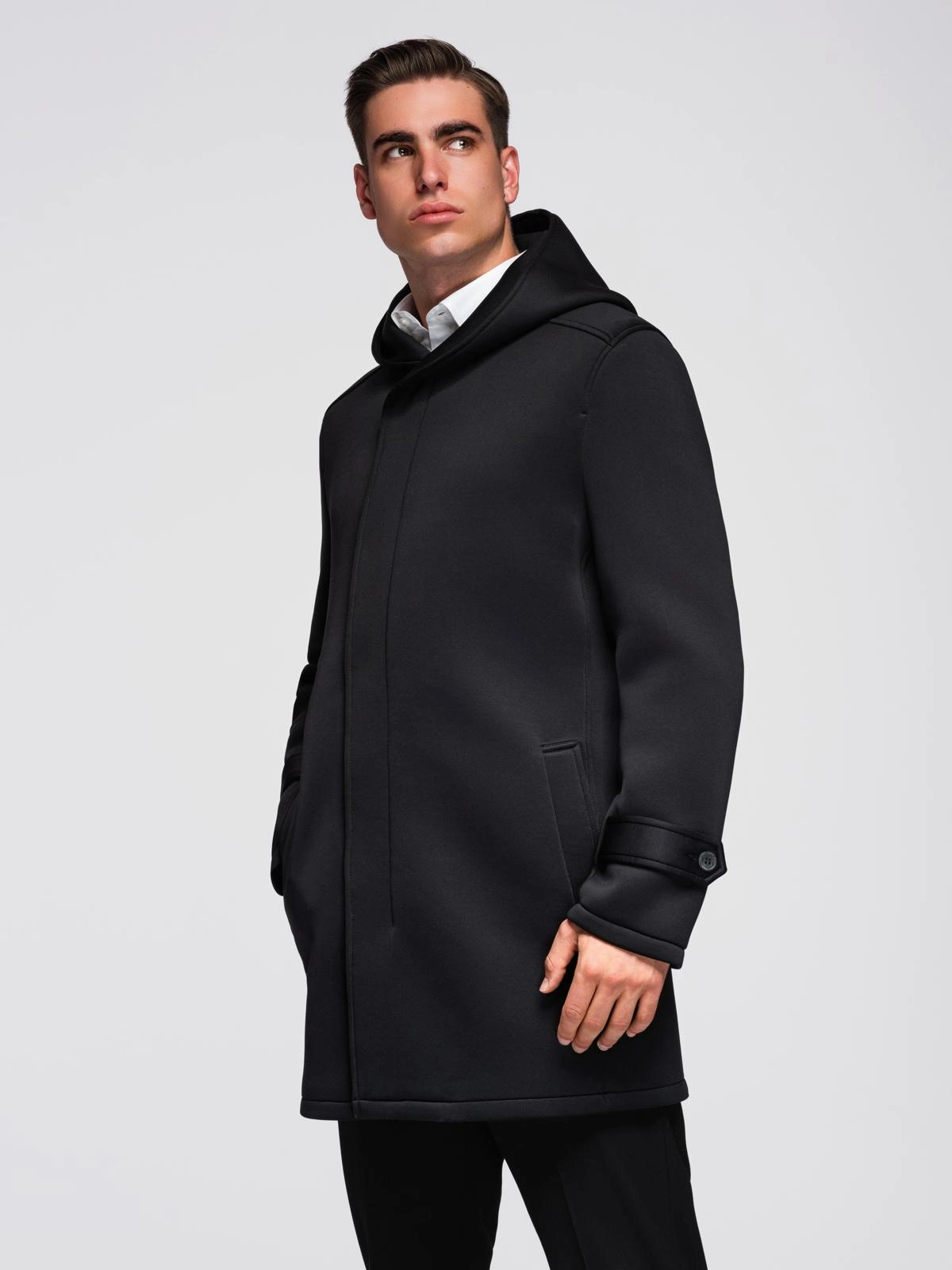 Pánsky minimalistický kabát strednej dĺžky s kapucňou - čierny V4 OM-COLC-0144