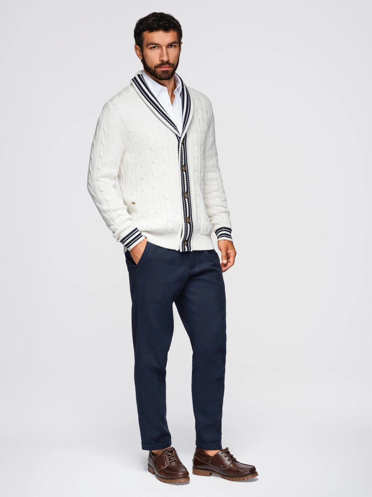 Pánsky sveter so šálovým golierom v preppy štýle - biely V1 OM-SWCD-0152
