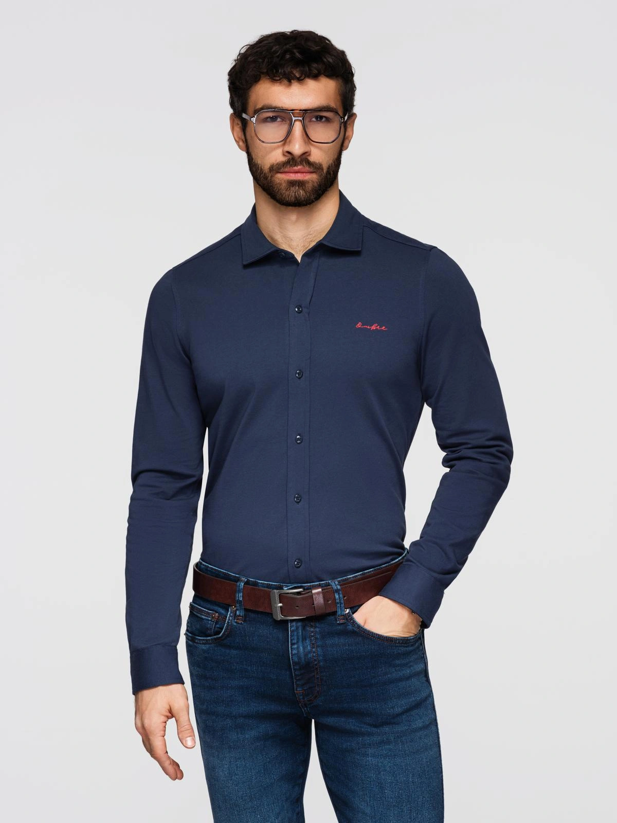 Pánska košeľa regular fit s dlhými rukávmi a klasickým golierom. Zapína sa na plnú gombíkovú légu; kontrastná výšivka na hrudi. Zadný sed pre stabilitu tvaru. Rukávy zakončené manžetami na gombíky a rozparkom s ďalším gombíkom. Spodná časť košele je zaoblená. Farebné gombíky s vyrytou značkou, prišité kontrastnou niťou vo farbe výšivky. Pletená konštrukcia poskytuje mäkkosť a pohodlie, zatiaľ čo bavlna podporuje prirodzenú priedušnosť a komfort pri každodennom nosení.