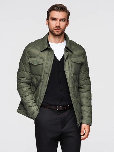 Pánska prešívaná bunda košeľového strihu - olivová V2 OM-JALP-0215