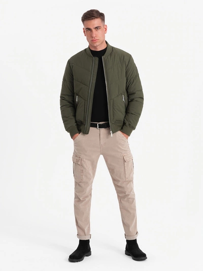 Pánska prešívaná bunda bomber s kovovými zipsami - tmavo olivovo zelená V3 OM-JALP-0143